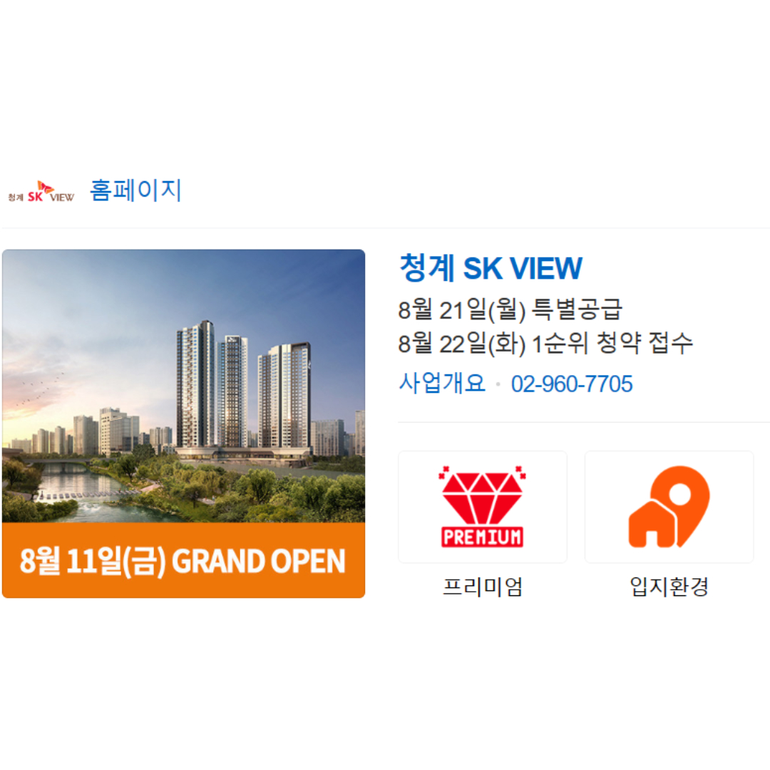 청계 SK VIEW 청약이 8월 21일 특별공급을 시작으로 분양예정이에요.
